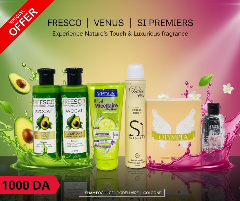 Offre spéciale à 1000 DA : Profitez d’une expérience de soins luxueux avec la collection Fresco, Venus, et Si Premiers ! Un shampoing et un démêlant à l’avocat pour des cheveux nourris, un gel micellaire pour un soin de la peau, un parfum Olympea envoûtant et une cologne Lovely pour compléter votre routine. Laissez-vous séduire par la nature et la douceur dans cette offre exceptionnelle !