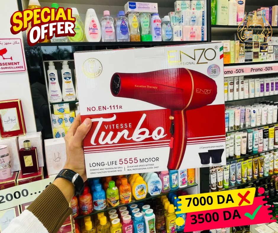 Offre Spéciale ! Sèche-cheveux ENZO Vitesse Turbo avec moteur longue durée 5555, réglages de chaleur et de vitesse, et embouts de concentration. Profitez d’une réduction incroyable : 3500 DA au lieu de 7000 DA ! Ne ratez pas cette offre.